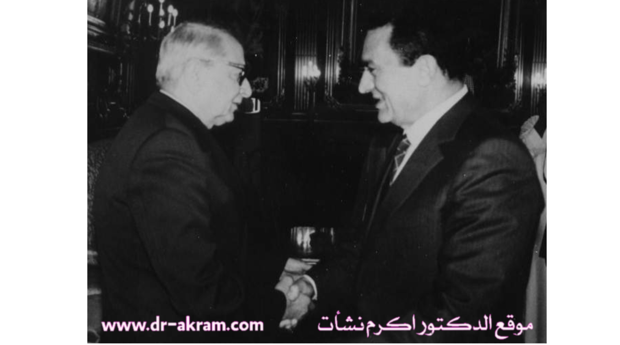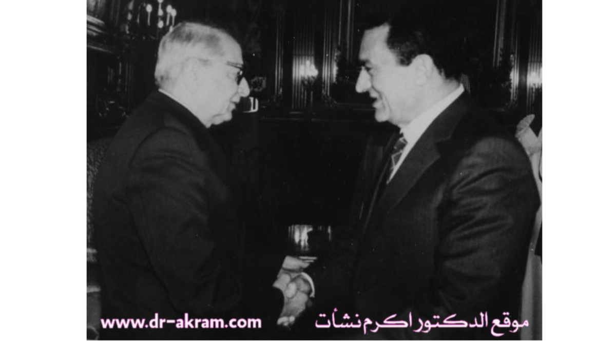 الرئيس المصري محمد حسني مبارك عند استقباله الدكتور اكرم نشات ابراهيم مع وزراء الداخلية المشاركين في الدورة الثامنة لمجلس وزراء الداخلية العرب .1989 القاهرة